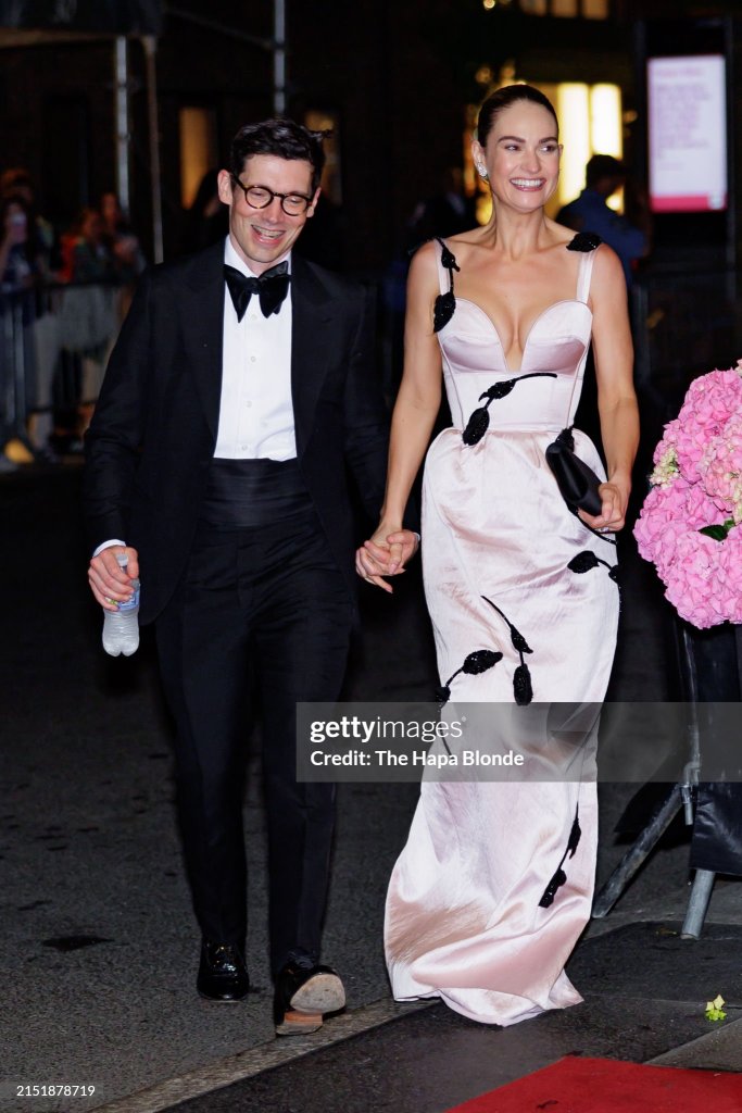 NEW YORK, NEW YORK – MAY 06: Erdem Moralioglu and Lily James are seen at The Carlyle Hotel on May 06, 2024 in New York City. (Photo by The Hapa Blonde/GC Images)